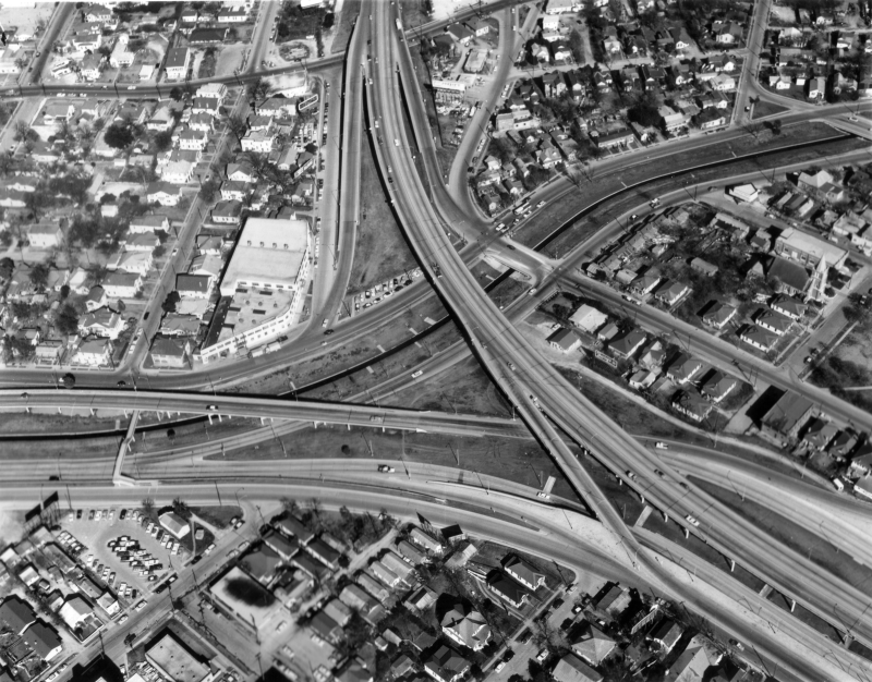 At the center-right, you can see the then-new cloverleaf built to connect eastbound I‑10 to northbound I‑35. It was removed around 1990 and replaced with the flyover that's there today.
