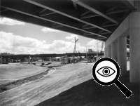This photo shows San Pedro Creek, which today is underground at this location. Today's "Finesilver Curve" would be at the right of this photo, and the road at the left is the exit to today's Santa Rosa Blvd. (N Laredo St. at that time.) The bridge in the center of the photo is the overpass leading to westbound I‑10 from Martin St.
