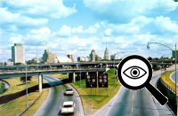 The ditch in the center of the expressway is San Pedro Creek; it's underground at this location today. Notice the construction of the Tower of the Americas at the far left.