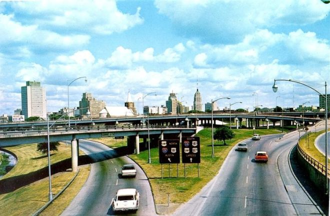Note the exit sign for at Commerce St. at the right — US 90 still ran along Commerce St. west of downtown at this time. The US 90 freeway would open shortly after this photo was taken.
