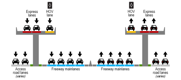 Below are typical cross-sections for the currently planned HOV lanes in the various corridors.