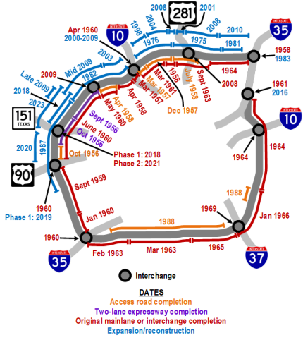 - 2023: The segment from Ingram Rd. to south of SH 151 expanded from eight to ten lanes. The first flyover — from northbound Loop 410 to eastbound I‑10 — in the upgraded I‑10 East interchange was opened.
