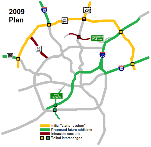 In this plan, new direct-connect ramps between intersecting roadways (tolled or non-tolled) would have been tolled. Tolled interchanges were proposed as part of the Loop 1604 managed lanes project. A tolled interchange at US 281 and Wurzbach Parkway was studied but determined to not be feasible. Other tolled interchanges were proposed on the planned Kelly Parkway at I‑35 and at Loop 410.